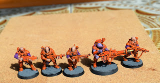 I decided to use orange as the base colour partly because I haven't any orange troops and partly because these are supposed to be civilian miners and orange, to me, suggests heavy industrial plant. I used purple as the contrasting tie-together colour. The bases are Tamiya Pavement dark-grey textured paint. I also liberally applied dark brown wash to dirt everything up.